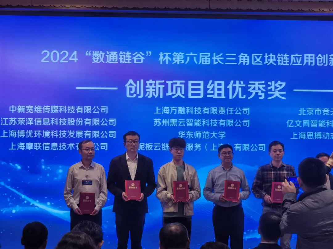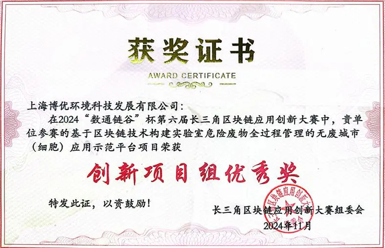 11月15日,2024“数通链谷” 杯第六届长三角区块链应用创新大赛决赛及颁奖活动在上海市静安区市北高新圆满落下帷幕。经过三个月激烈的角逐,上海博优环境科技发展有限公司参赛的“基于区块链技术构建实验室危险废物全过程管理的无废城市(细胞)应用示范平台”脱颖而出,荣获长三角区块链应用创新大赛创新项目组优秀奖。